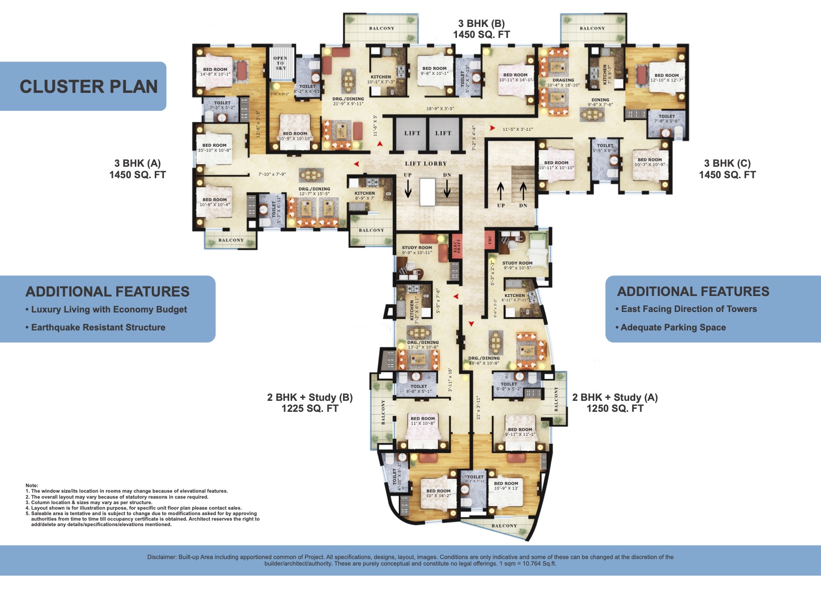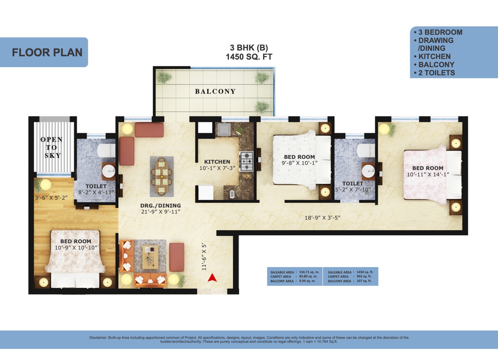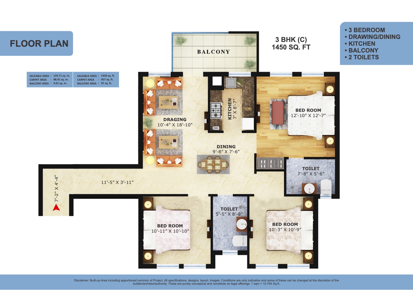 Floor Plan - 3BHK - 1450 Sq Ft - Type C