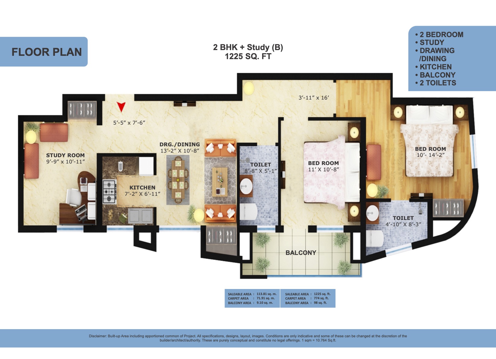 Floor Plan - 2BHK+ Study - 1225 Sq Ft