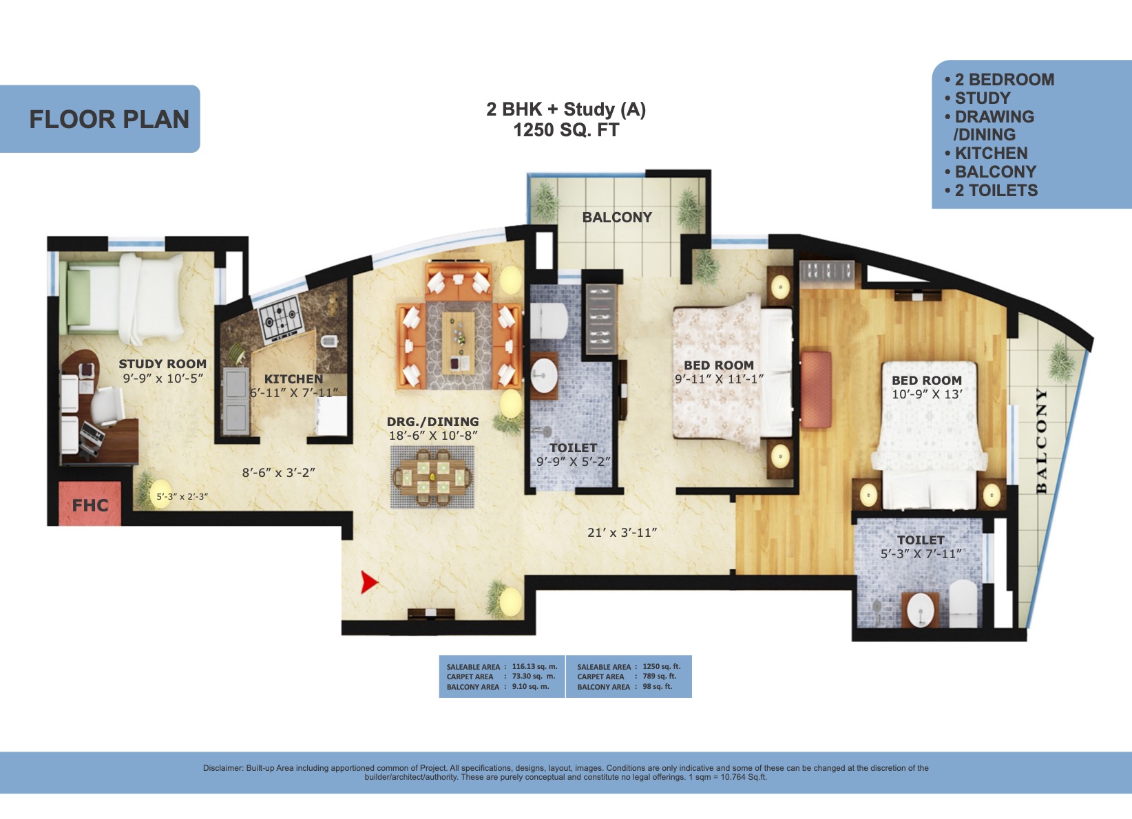 Floor Plan - 2BHK+ Study - 1250 Sq Ft